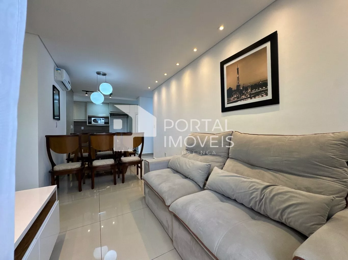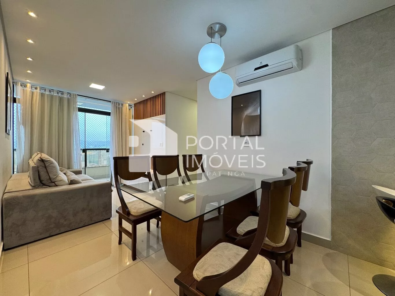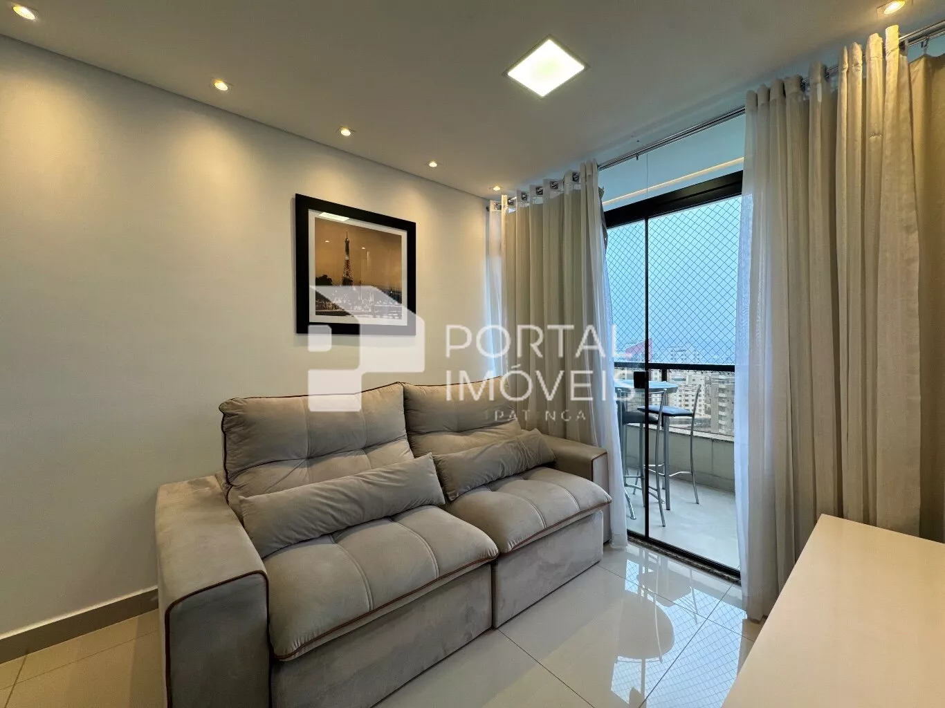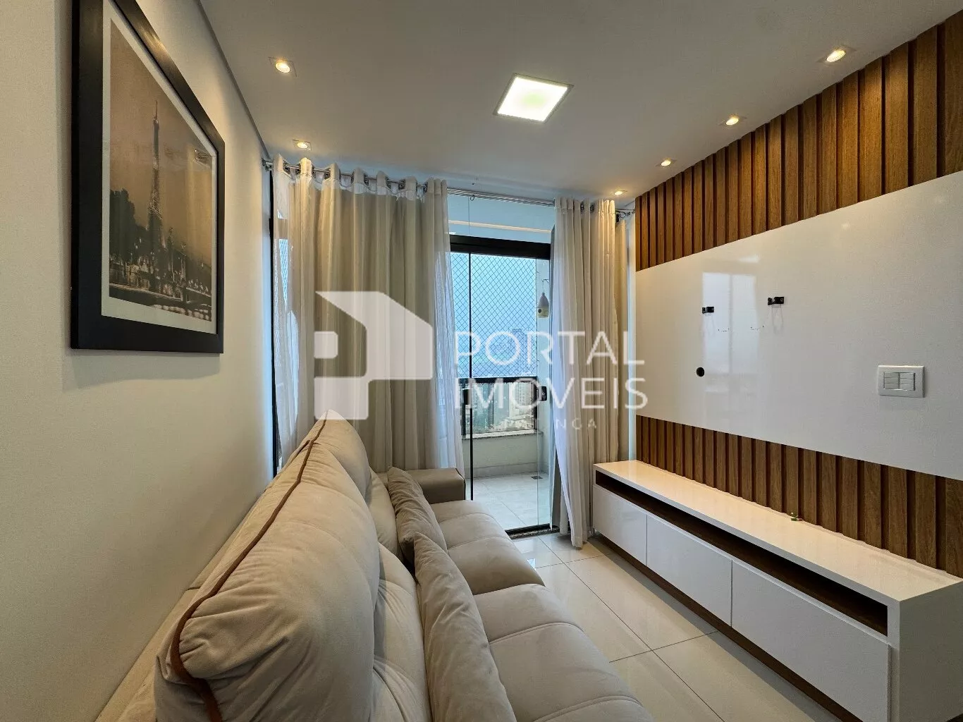 🛋️ Sala com sofá retrátil, painel de TV, cortina e integração com a sacada