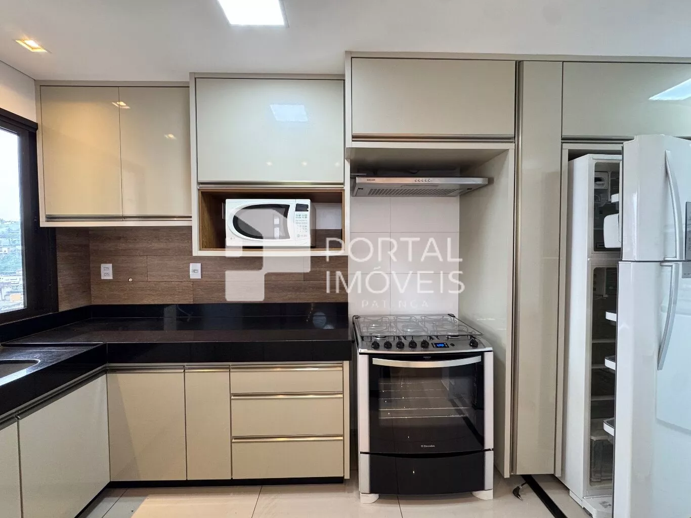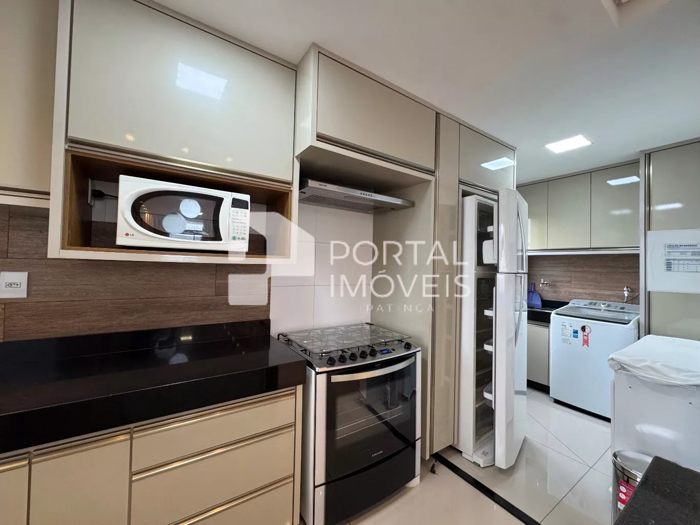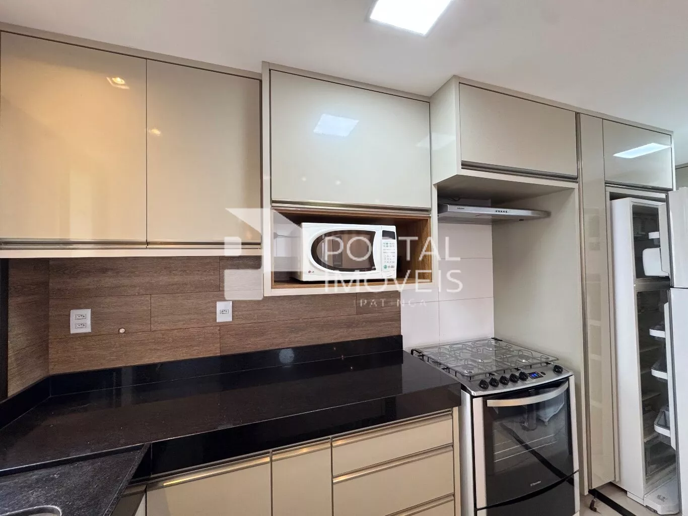 🍽️ Cozinha planejada com armários, fogão com forno, coifa, micro-ondas e geladeira duplex