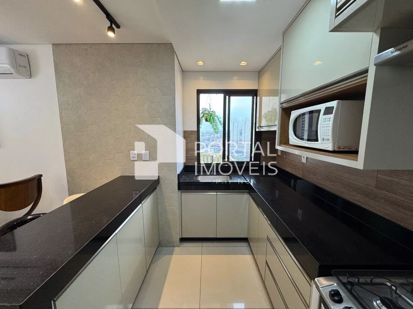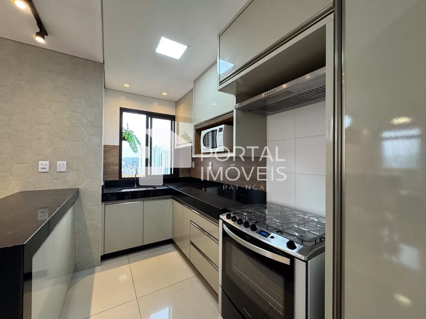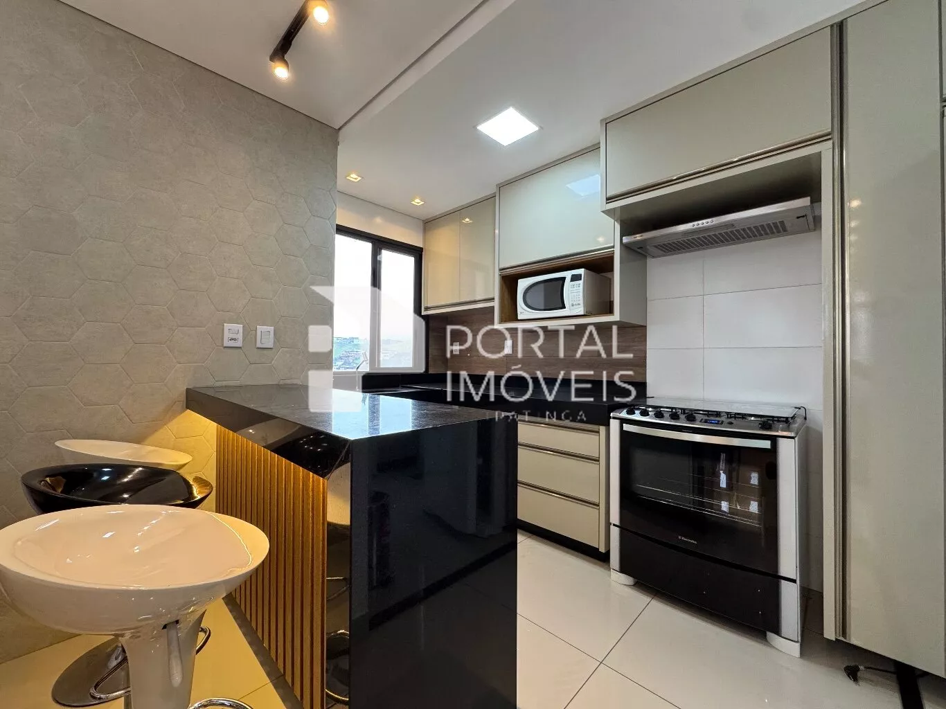 🍽️ Cozinha planejada com armários, fogão com forno, coifa, micro-ondas e geladeira duplex