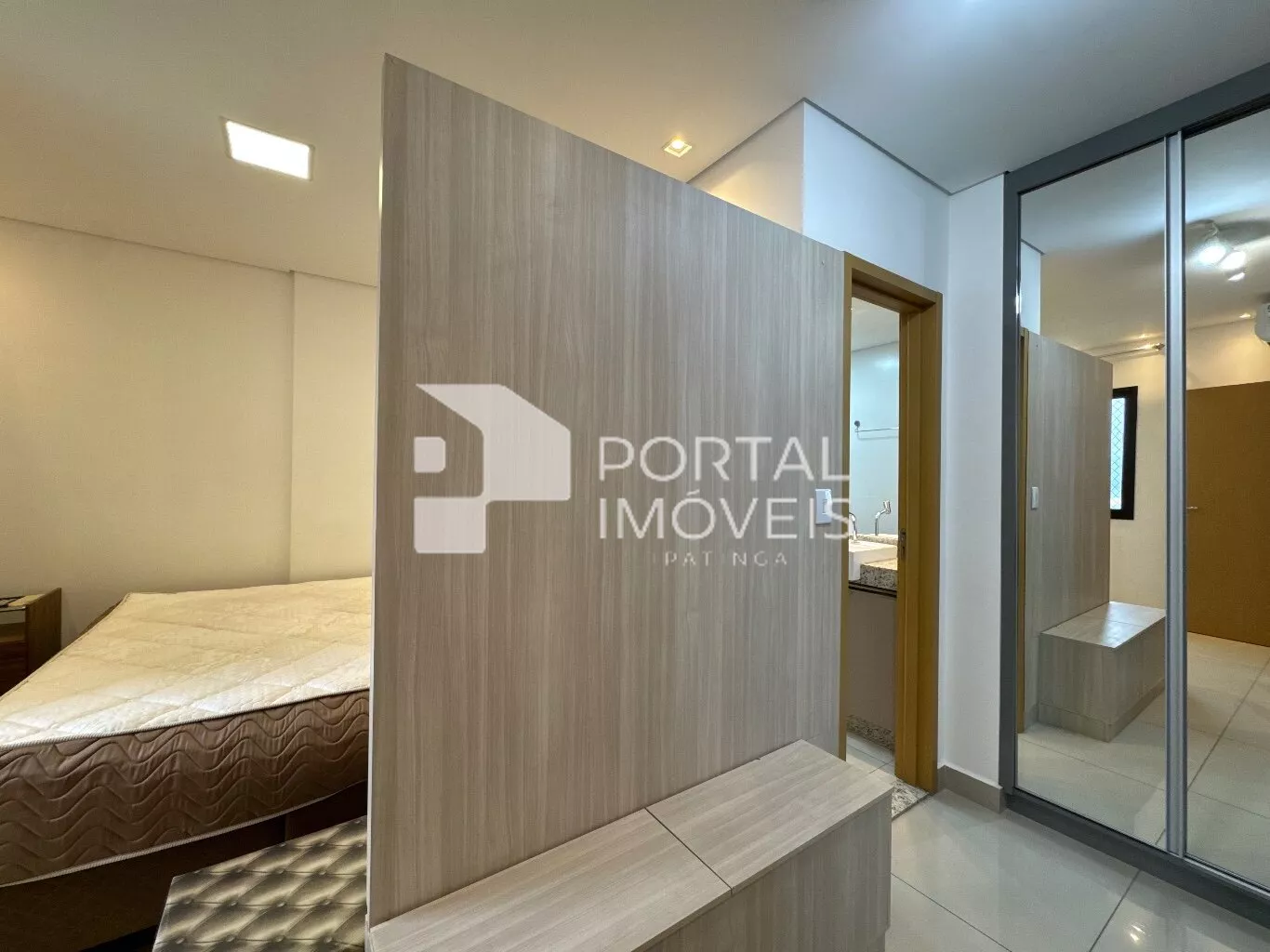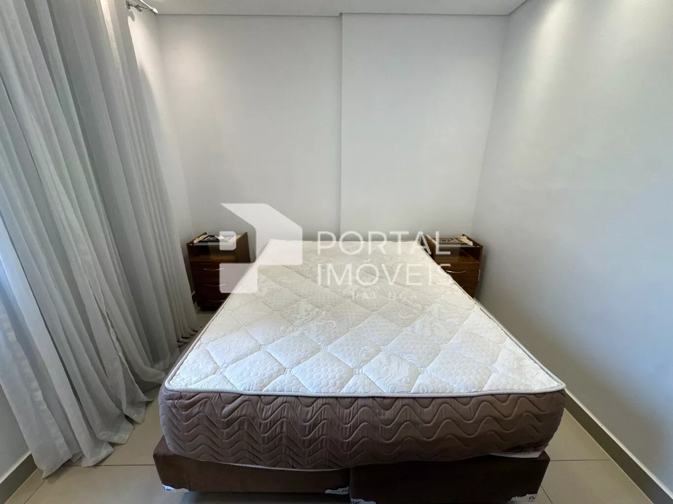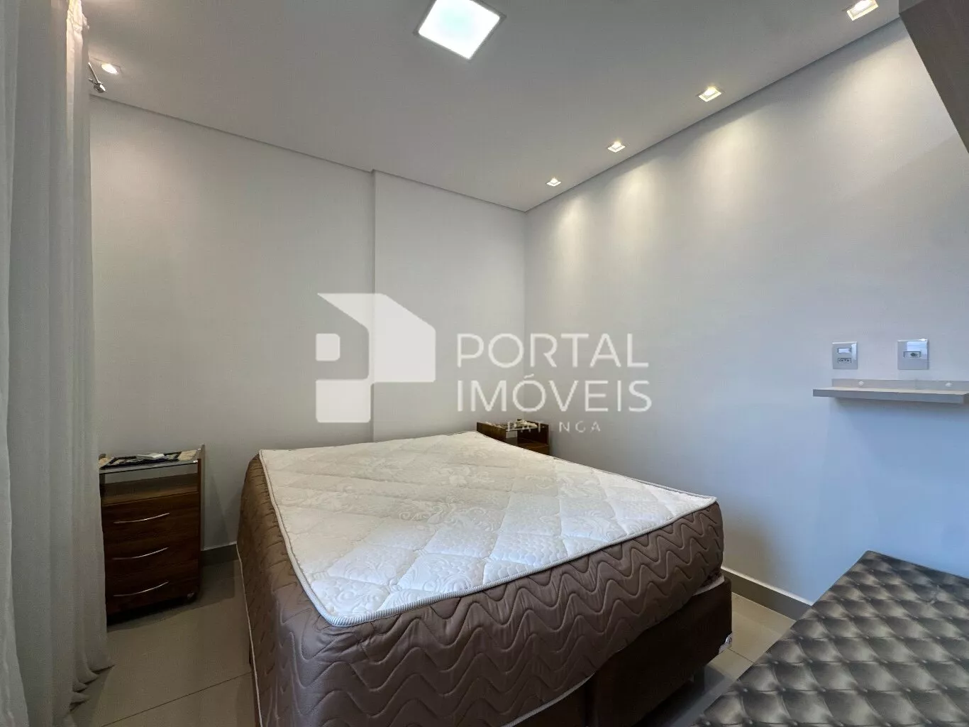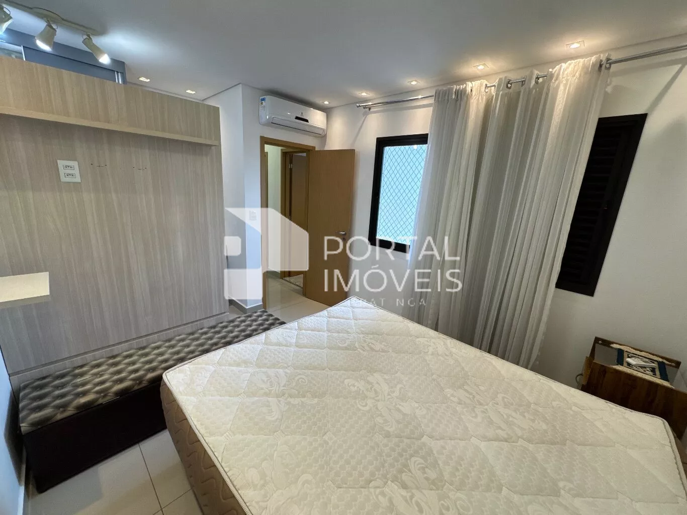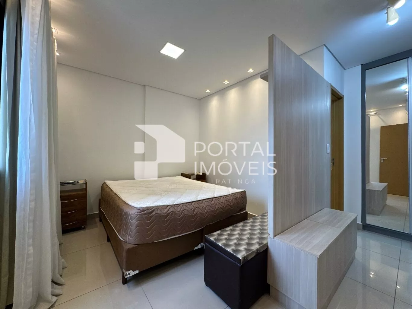🛏️ Suíte com cama box de casal, duas mesas de cabeceira, cortina, painel de TV, penteadeira e armário planejado
