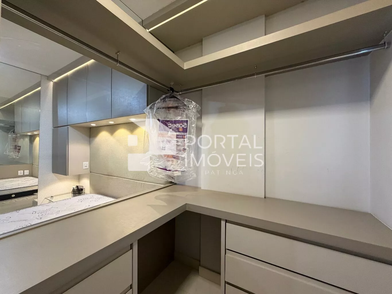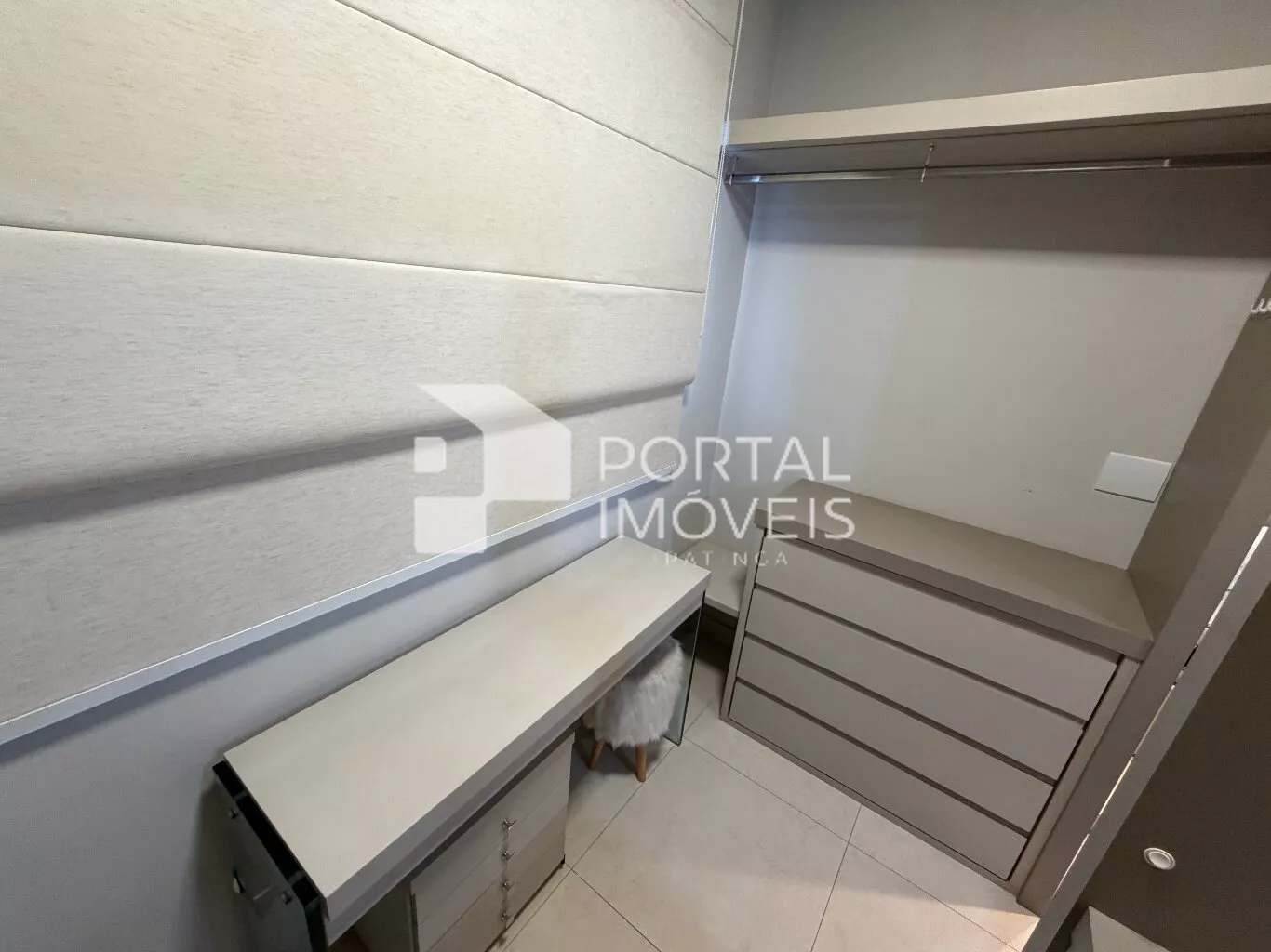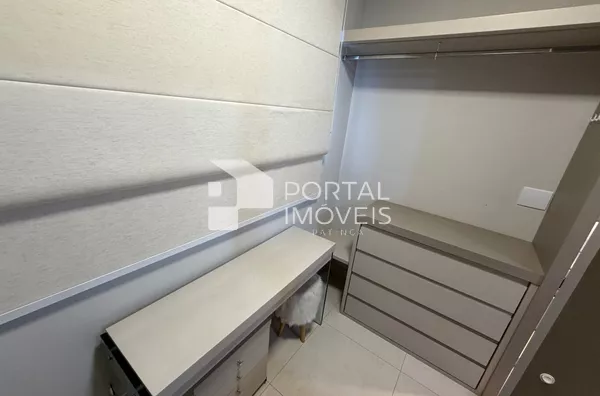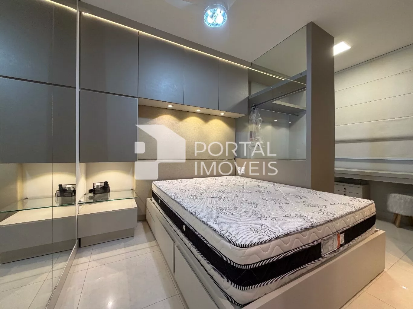🛌 Suíte completa com cama queen box, armários planejados, penteadeira, painel de TV, televisão, ar-condicionado e ventilador de teto