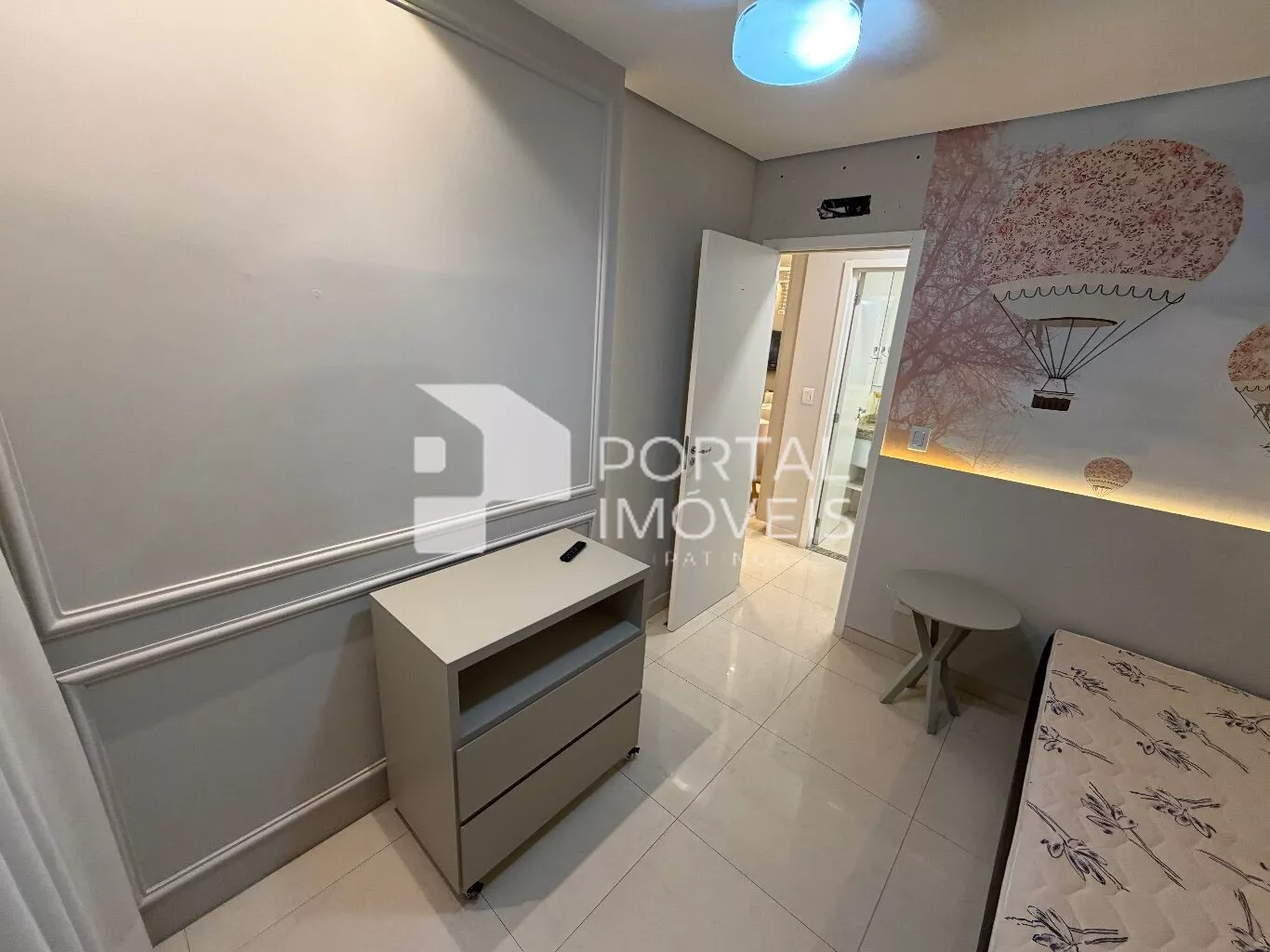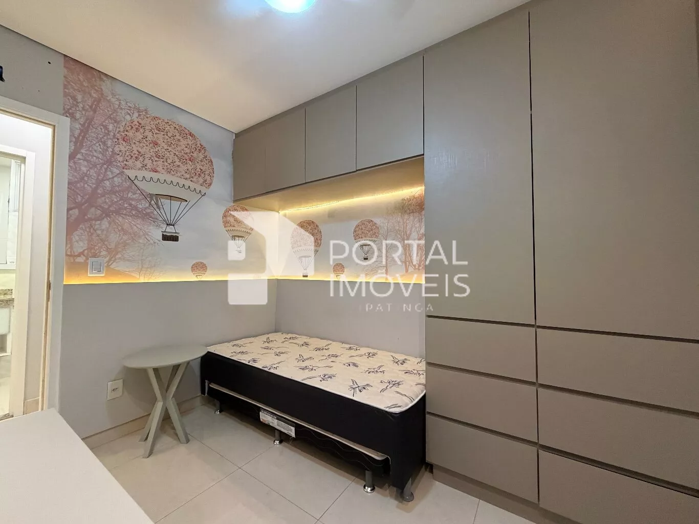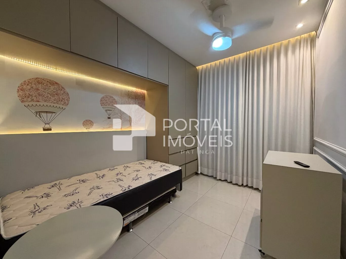 🛏️ Quarto de solteiro com cama box, armários planejados, cortinas e ventilador de teto