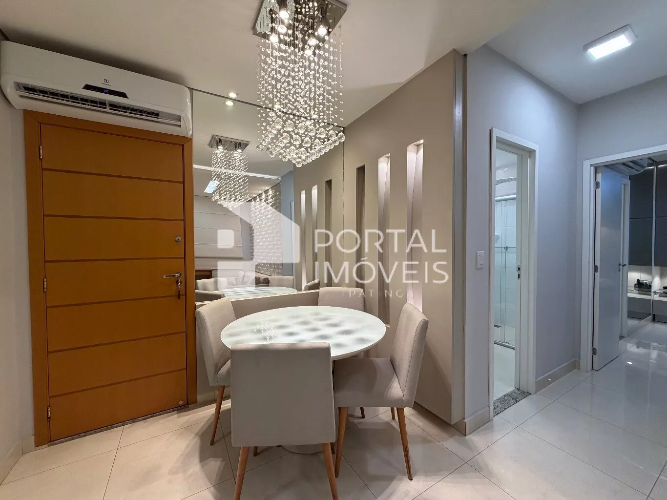 🍽️ Copa integrada com mesa redonda, 4 cadeiras, lustre imponente e espelho decorativo ampliando o ambiente