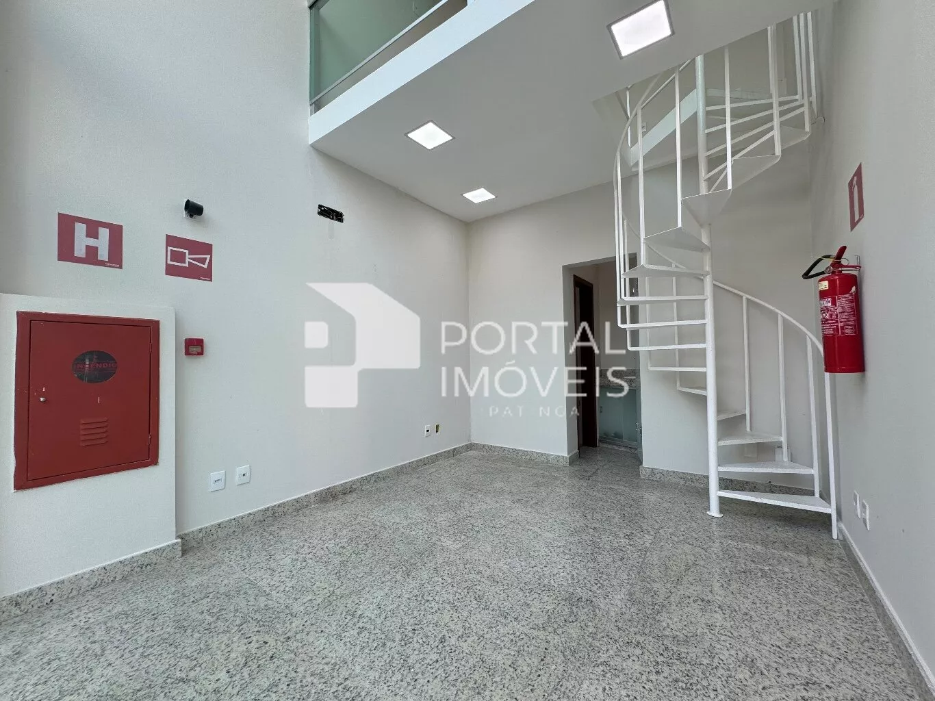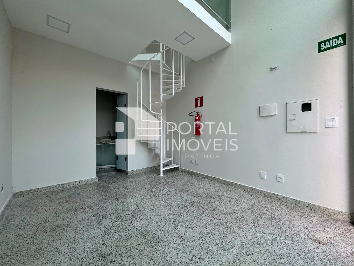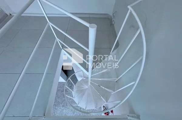 A loja possui um mezanino com escada de ferro em espiral, proporcionando um ambiente charmoso e prático.