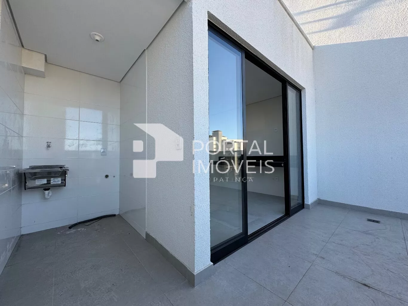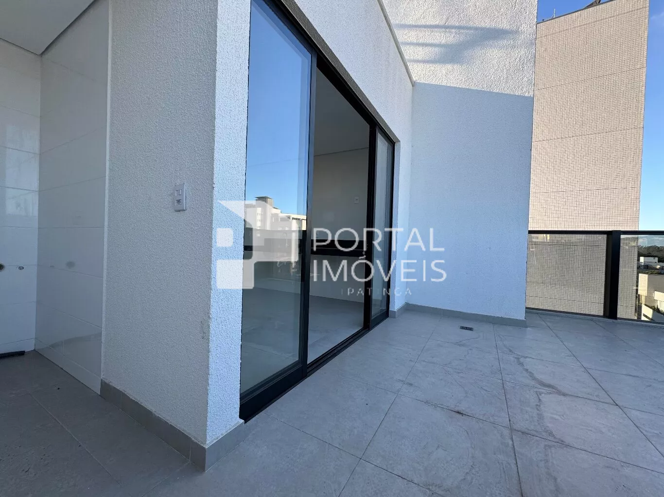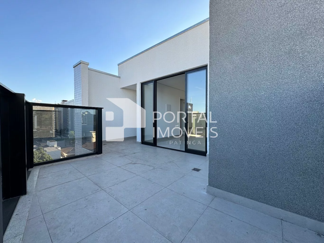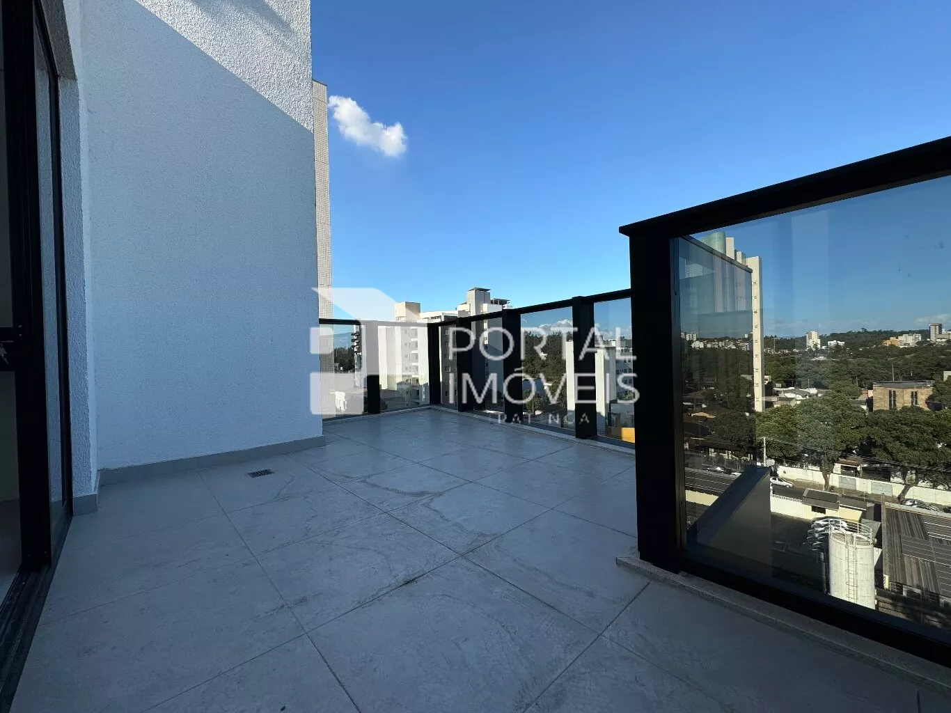 Área aberta com guarda-corpo de vidro, ideal para receber amigos e apreciar a vista